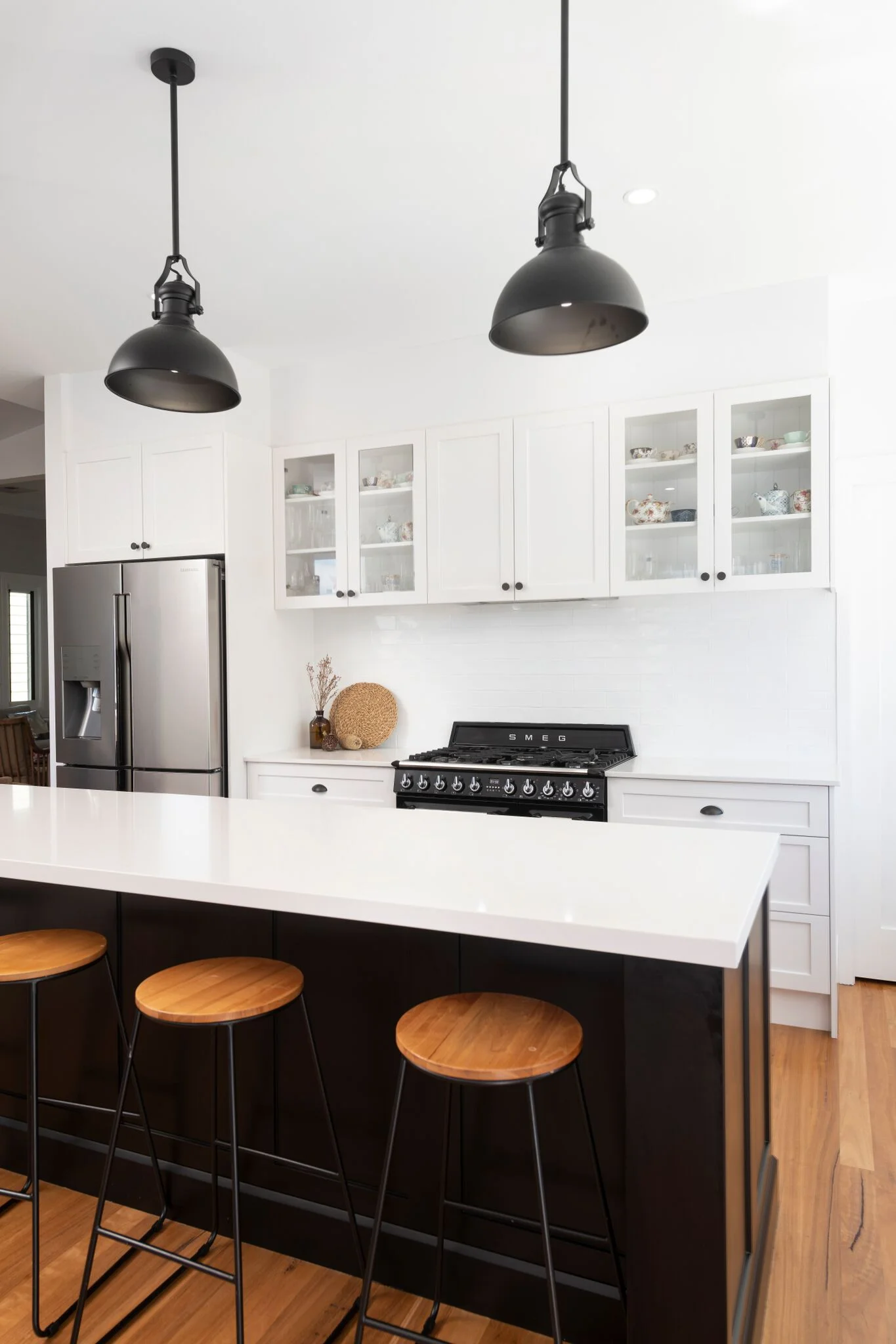 With Jamberoo being such a beautiful part of the world, it was worth every minute of the four hour drive South from Newcastle. Mitchell & Catherine worked hand in hand with Everlong Joinery in designing their dream Kitchen & Butlers Pantry, with Catherine showing her own creative flair and impeccable taste the brief was classic industrial-style & it was all in the detail. It is the Shaker style doors, the industrial pendant lights & the black freestanding oven that are the focal point in the kitchen along with the white hex tile with contrasting grout.