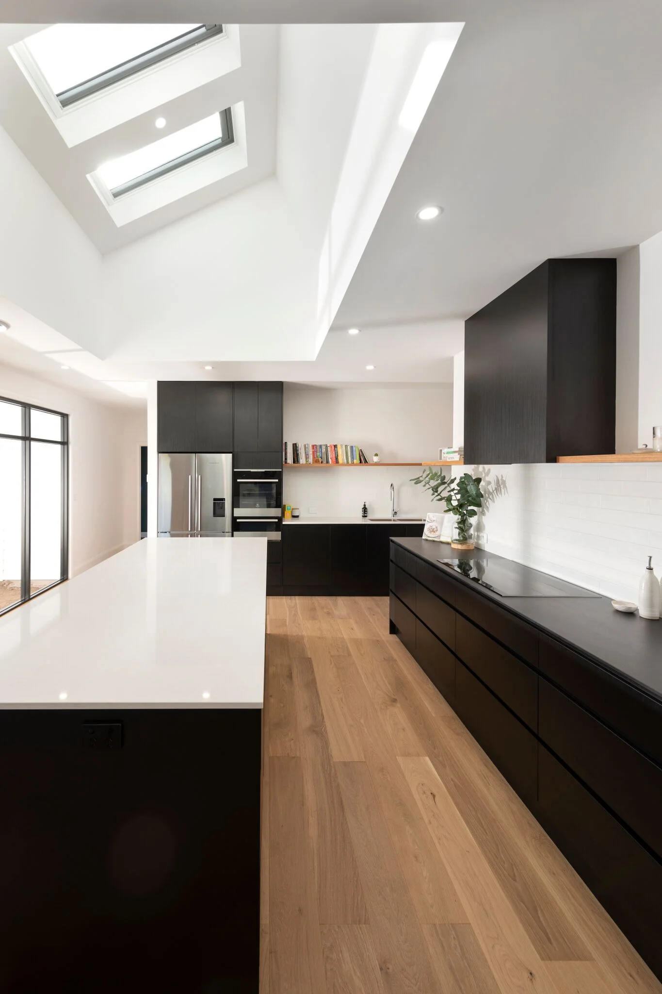 After considering a wide variety of materials, it was decided that black polyurethane cabinetry and timber highlights would have the high contrast that the space required. Once we were happy with this combination it was then a concern that flat, handless polyurethane doors were a little too flat which is what inspired us to create texture and interest by matching the 150mm V groove panelling to the timber panelling in the void. We then decided to play with the idea of wrapping this polyurethane panelling, floor to ceiling right around the pantry walls which would help to integrate the black joinery in to the living space which in turn would also link the black steel frames of the second level above.