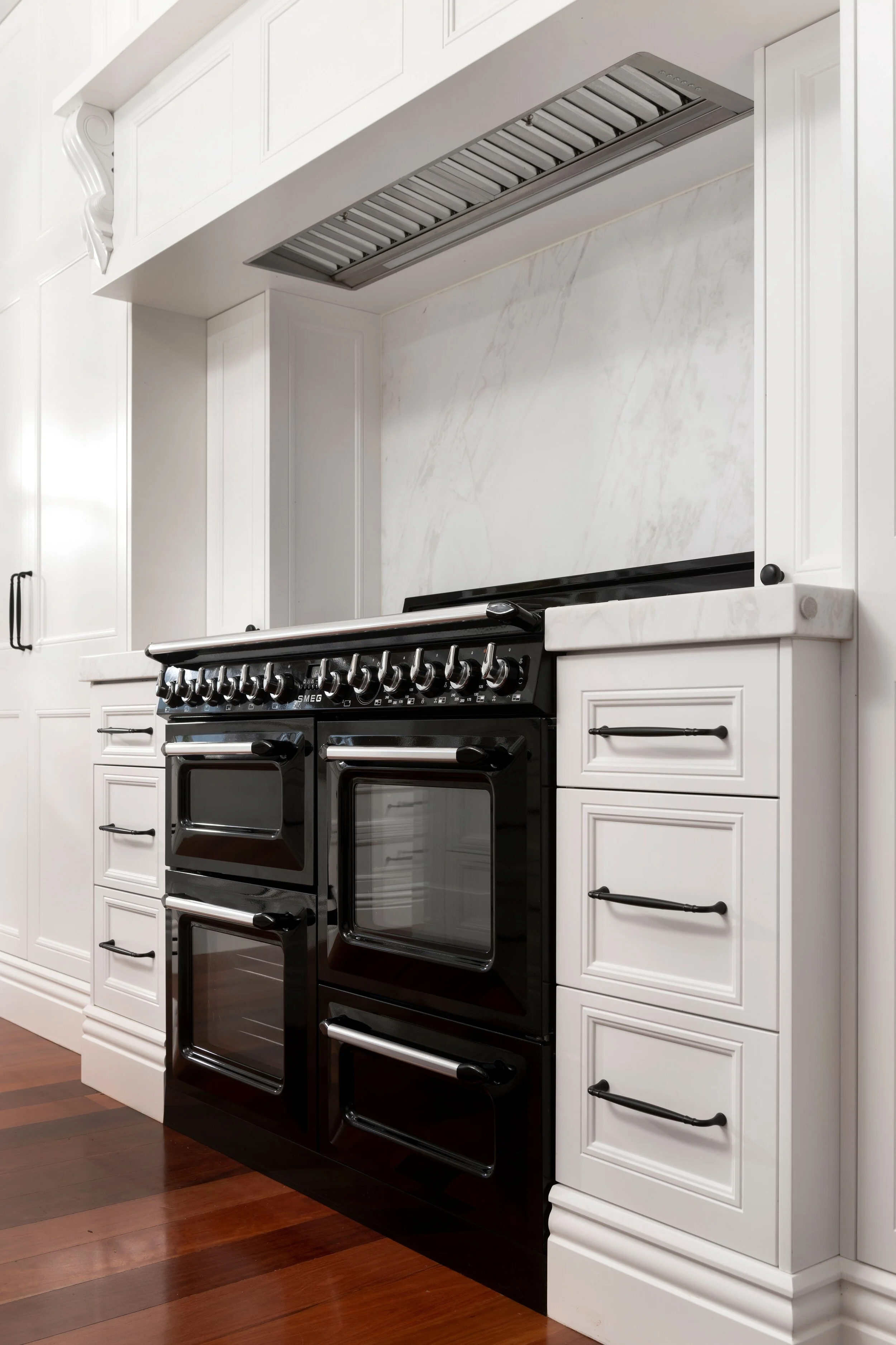Carcase: 16mm HMR particle board in white, Black carcass board behind black doors Door & Drawer Faces: 2pac Polyurethane, V groove profile in Dulux-Lexicon 1/4 strength Feature Doors: Polytec Ravine-Black Wenge Benchtops: 40mm Engineered Quartz-Silestone Eternal Calacutta Gold Drawer Runners: Blum Legrabox-Matt black Door Hinges: Blum soft close Floor: Solid Timber Splashback: White shell tile