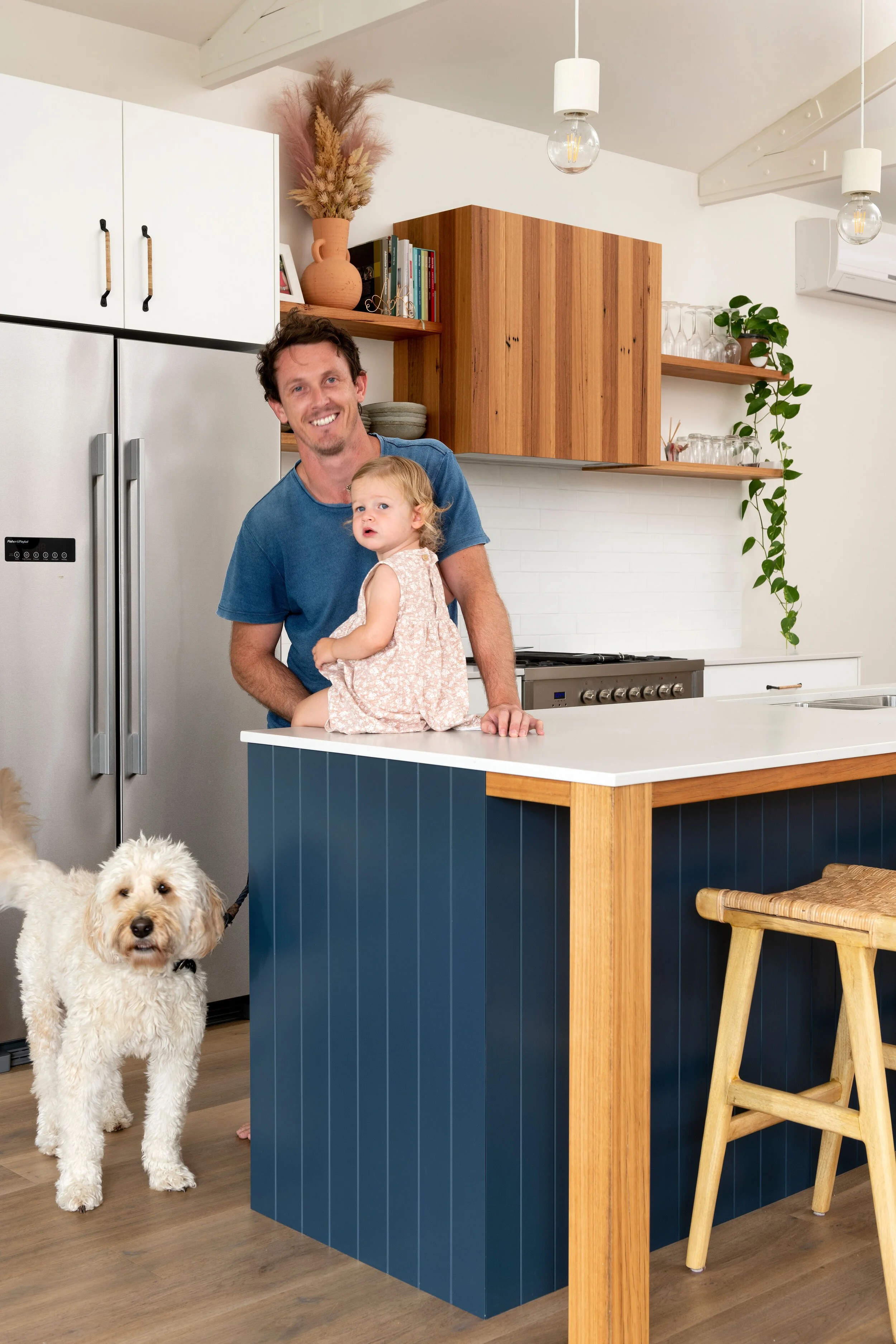 Carcase: 16mm HMR particleboard in white Doors & Drawer Faces: 2 pac Polyurethane-Shaker profile in British Paints-Star White Zilch finish + Feature colour in colorbond Night Sky Zilch finish Benchtops: 20mm Quantum Quartz Statuario Quartz with undermount sink cut out Floating Shelves: 35mm thick recycled timber with a clear matt polyurethane finish Splashback: gloss white subway tile laid in Herringbone pattern Rangehood: Gyprock Feature box, painted in British Paints Star White Floors: Solid Blackbutt.