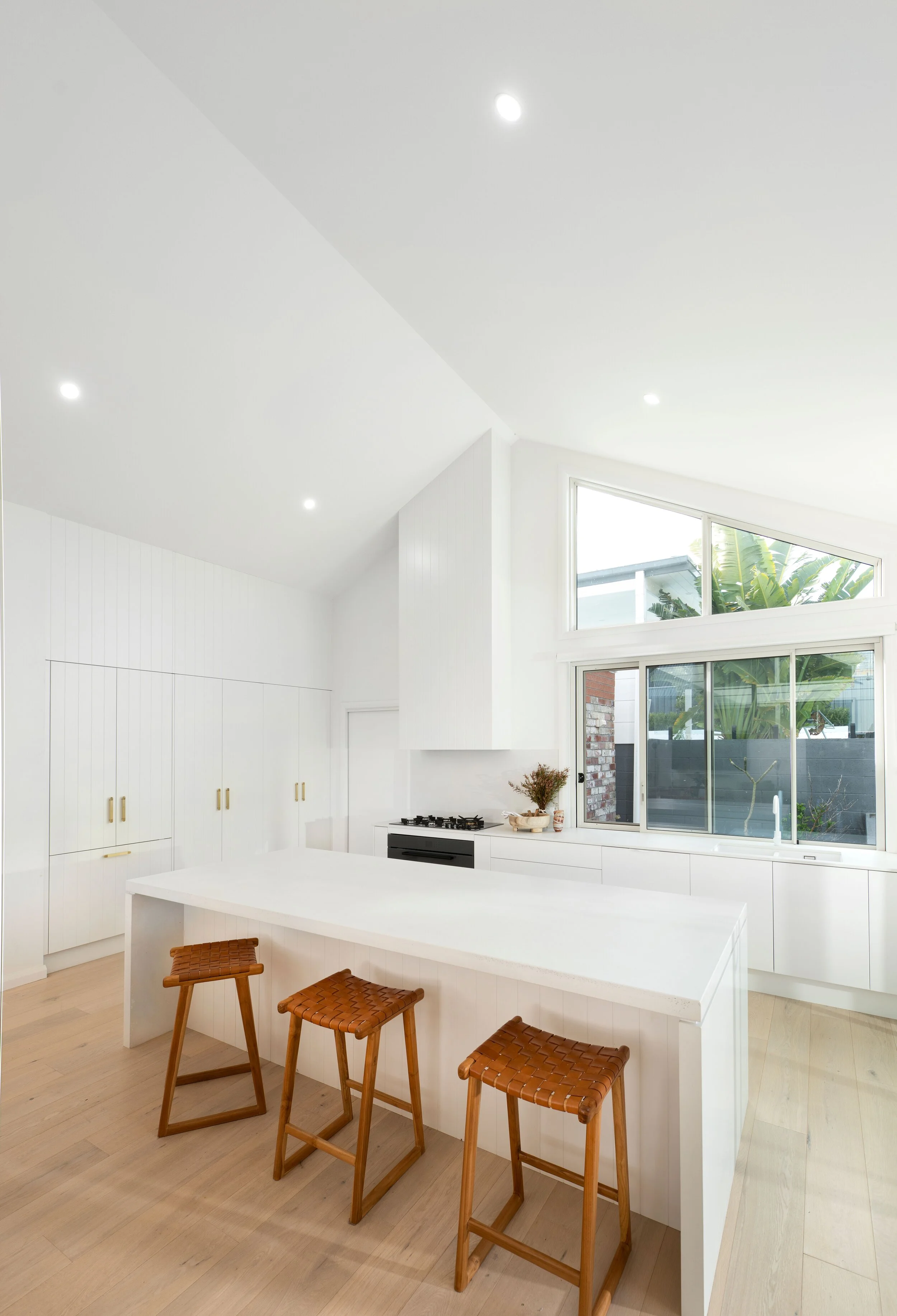The first and most important consideration was how to seamlessly incorporate the kitchen into the rest of the living area without seeming insignificant in such a grand space. The pantry space was allocated by the Architect Jodie Dixon which created a pocket at the back of the house to house the kitchen, this ensured the kitchen was out of the line of sight from the front entry and enabled a clear view to the backyard.