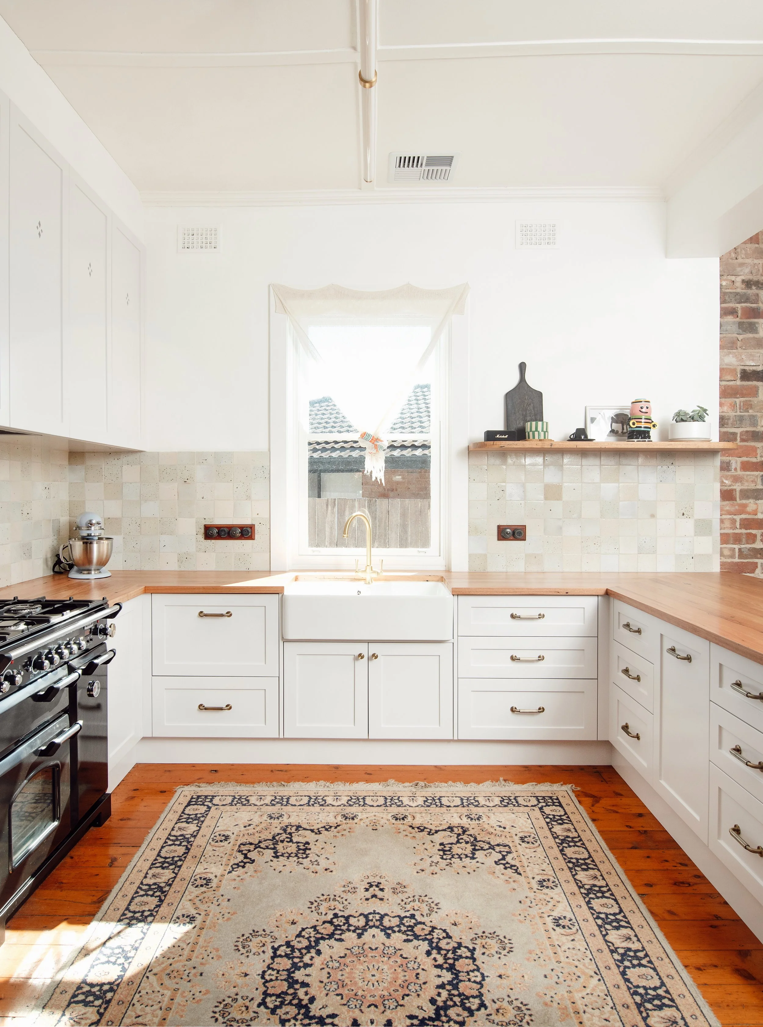 Benchtops: 35mm Recycled Timber from Round 2 Timbers, finished in clear, matt polyurethane. Custom Brass end from Austmont